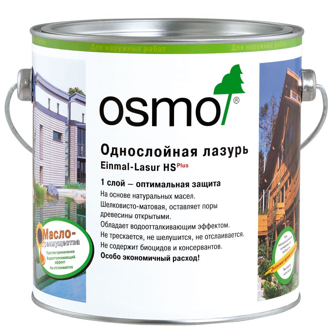 Однослойная лазурь Osmo Einmal-Lasur HSPLUS подходит для защиты древесины для наружных работ: навесов для автомобилей, деревянных фасадов, балконов, заборов, пергол, садовой мебели и садовых домиков. Особенно рекомендована для обновления старых открыто-пористых лазурей.